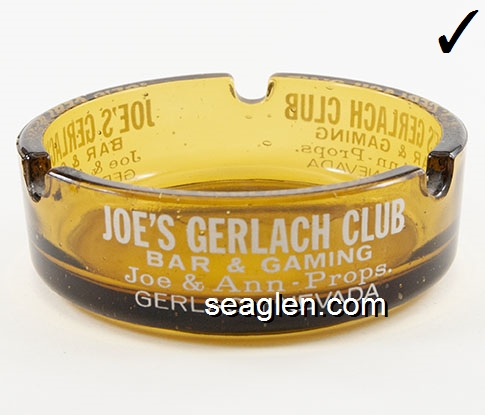 JGC-04 Joe's Gerlach Club Gerlach, NV 3 9/16" Amber Glass Ashtray White imprint: Joe's Gerlach Club, Bar & Gaming, Joe & Ann Props. Gerlach, Nevada |