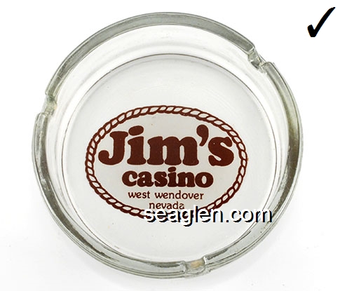 JIM-03 Jim's Casino & Saloon Wendover, NV 3 1/2" Clear Glass Ashtray Red on white imprint: Jim's casino, west wendover nevada |