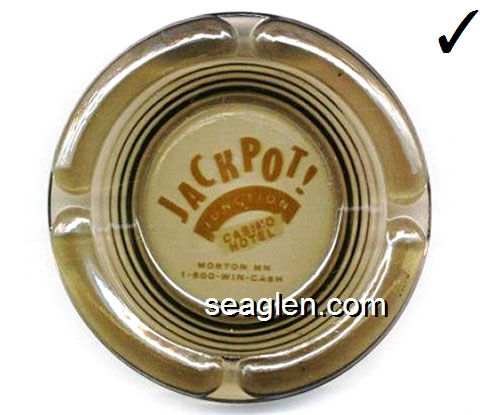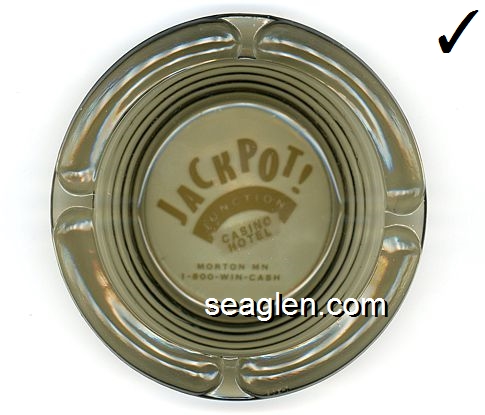 JJU-B1 Jackpot Junction Casino Hotel Morton, MN 4 1/2" Smoke Glass Ashtray Yellow imprint: Jackpot! Junction Casino Hotel, Morton MN, 1-800-WIN-CASH (3 sniffers) |
