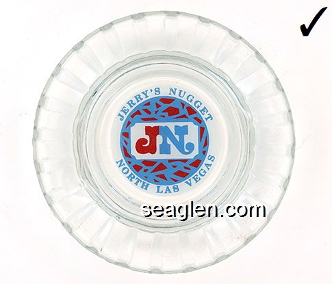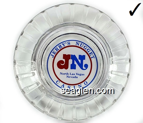 JNC-09 Jerry's Nugget Casino Las Vegas, NV 4 1/2" Clear Glass Ashtray Red and blue on white imprint: Jerry's Nugget, JN, North Las Vegas |
