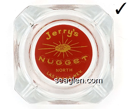 JNC-B1 Jerry's Nugget Casino Las Vegas, NV 3 1/2" Amber Glass Ashtray Gold on red imprint: Jerry's Nugget, North Las Vegas, Nev. (Like JNC-02, except Style A) |