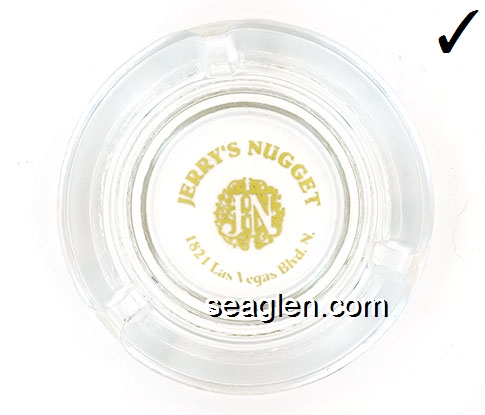 JNC-D1 Jerry's Nugget Casino Las Vegas, NV 4 1/4" Clear Glass Ashtray Gold imprint: Jerry's Nugget, JN, 1821 Las Vegas Blvd. N. |