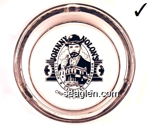 JNL-B1 Johnny Nolon's Cripple Creek, CO 4 1/8" Smoke Glass Ashtray Black on white imprint: Johnny Nolon's Saloon & Gambling Emporium |