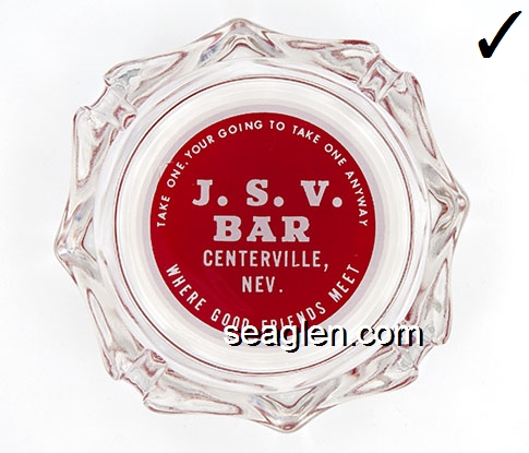 JSV-A1 J.S.V. Bar Centerville, NV 3 3/4" Clear Glass Ashtray White on red imprint: Take one, your going to take one anyway, J. S. V. Bar, Centerville, Nev., Where good friends meet |