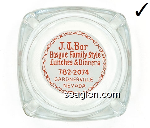 JTB-A2 J & T Bar Gardnerville, NV 3 1/4" Clear Glass Ashtray Red on white imprint: J. T. Bar, Basque Family Style Lunches & Dinners, 782-2074, Gardnerville, Nevada |