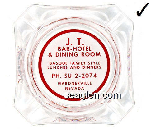 JTB-B1 J & T Bar Gardnerville, NV 4 1/4" Clear Glass Ashtray Red on white imprint: J. T. Bar - Hotel & Dining Room, Basque Family Style Lunches and Dinners, PH. SU 2-2074, Gardnerville, Nevada |