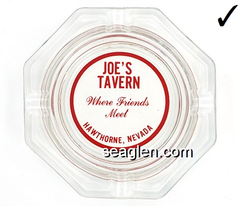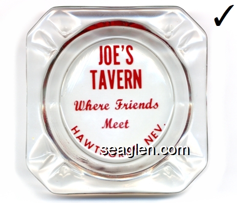 JTV-E1 Joe's Tavern Hawthorne, NV ?" Clear Glass Ashtray Red imprint: Joe's Tavern, Where Friends Meet, Hawthorne, Nevada |