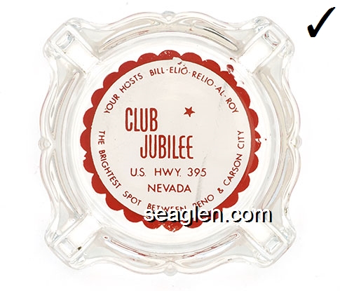 JUB-02 Jubilee Pleasant Valley, NV 3 11/16" Clear Glass Ashtray Red on white imprint: Club Jubilee, U.S. Hwy. 395 Nevada, Your Hosts Bill - Elio - Relio - Al - Roy, The Brightest Spot Between Reno & Carson City |