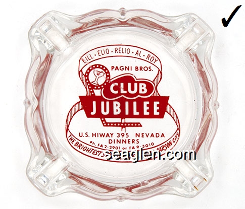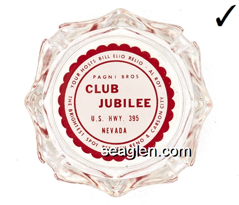 JUB-F1 Jubilee Pleasant Valley, NV 3 3/4" Clear Glass Ashtray Red on white imprint: Bill - Elio - Relio - Al - Roy, Pagni Bros., Club Jubilee, U.S. Hiway 395 Nevada, The Brightest Spot Between Reno & Carson City |