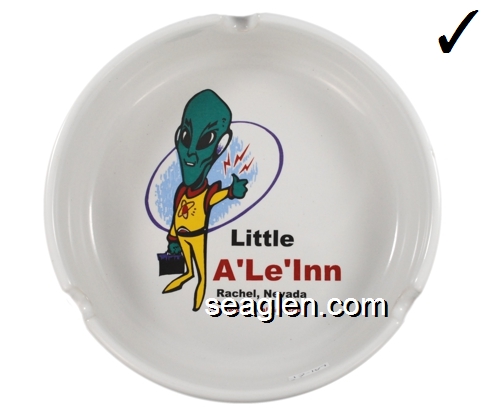 LAI-C1 Little Ale Inn Rachel, NV 4 5/8" White Porcelain Ashtray Black and red imprint: Little A'Le'Inn, Rachel, Nevada, www.littlealeinn.com |