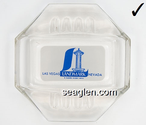 LAN-01 Landmark Hotel Las Vegas, NV 5" Clear Glass Ashtray Blue on white imprint: Las Vegas, Landmark, Nevada, A Hughes Resort Hotel (SAFEX style) |