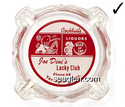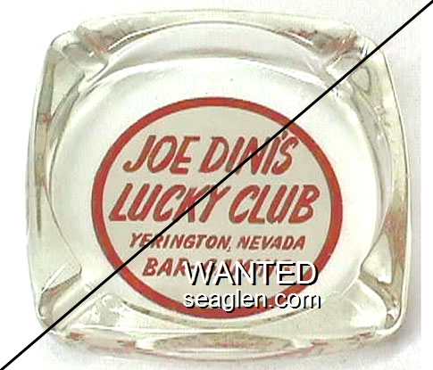 LCD-02 Lucky Club, Joe Dini's Yerington, NV 3 11/16" Clear Glass Ashtray Red on white imprint: Cocktails, Jackpots, Liquors, Beer on Tap, Joe Dini's Lucky Club, Phone 68, Yerington, Nev. |