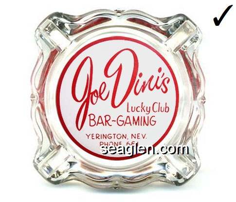 LCD-04 Lucky Club, Joe Dini's Yerington, NV 3 11/16" Clear Glass Ashtray Red on white imprint: Joe Dini's Lucky Club, Bar - Gaming, Yerington, Nev. Phone 681 |