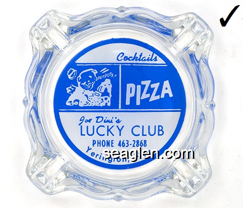 LCD-C1 Lucky Club, Joe Dini's Yerington, NV ?" Clear Glass Ashtray Blue on white imprint: Cocktails, Pizza, Joe Dini's Lucky Club, Phone 463-2868, Yerington, Nev. |