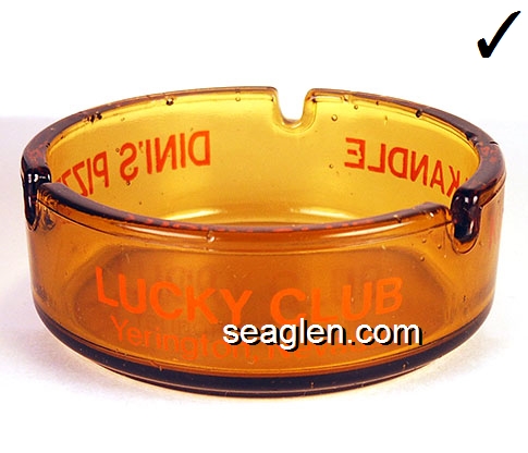 LCD-E1 Lucky Club, Joe Dini's Yerington, NV 3 1/2" Smoke Glass Ashtray Orange imprint: Lucky Club, Yerington, Nevada, Keg 'n Kandle Lounge, Dini's Pizzeria (Like LCD-08, except smoke glass) |