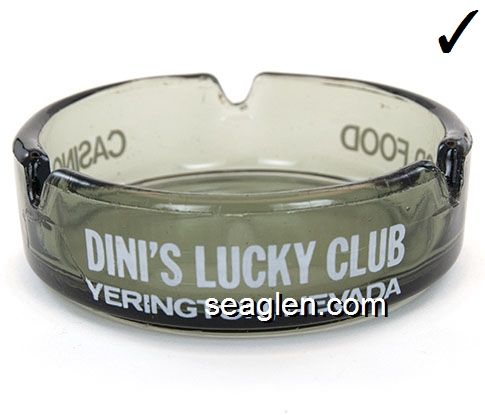 LCD-B3 Lucky Club, Joe Dini's Yerington, NV 3 5/8" Smoke Glass Ashtray White imprint: Dini's Lucky Club, Yerington, Nevada, Good Food, Casino |