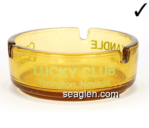 LCD-B5 Lucky Club, Joe Dini's Yerington, NV 3 1/2" Amber Glass Ashtray Green imprint: Lucky Club, Yerington, Nevada, Keg 'n Kandle Lounge, Casino & Dancing |