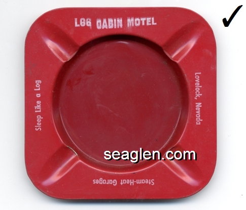 LCM-A1 Log Cabin Motel & Coffee Shop Lovelock, NV 4 1/8" Red Metal Ashtray White imprint: Log Cabin Motel, Lovelock, Nevada, Sleep Like a Log, Steam-Heat Garages |