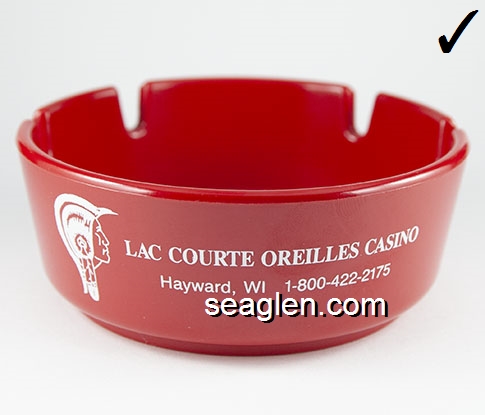 LCO-A1 Lac Courte Oreilles Casino Hayward, WI 4 1/8" Red Plastic Ashtray White imprint: Lac Curte Orelles Casino, Hayward, WI, 1-800-422-2175 |