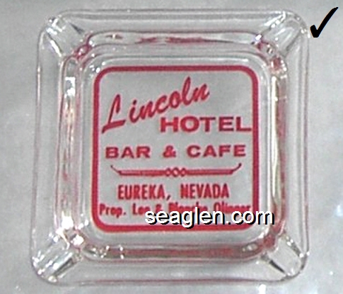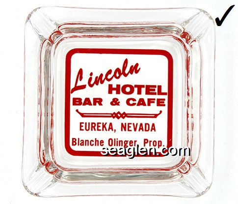 LHB-A1 Lincoln Hotel & Bar Eureka, NV 4 1/16" Clear Glass Ashtray Red imprint: Lincoln Hotel Bar & Cafe, Eureka, Nevada, Blanche Olinger, Prop. |