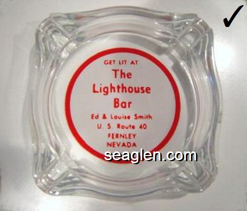 LHF-A1 Light House Bar Fernley, NV 3 7/16" Clear Glass Ashtray Red on white imprint: Get Lit At The Lighthouse Bar, Ed & Louise Smith, U. S. Route 40, Fernley, Nevada |