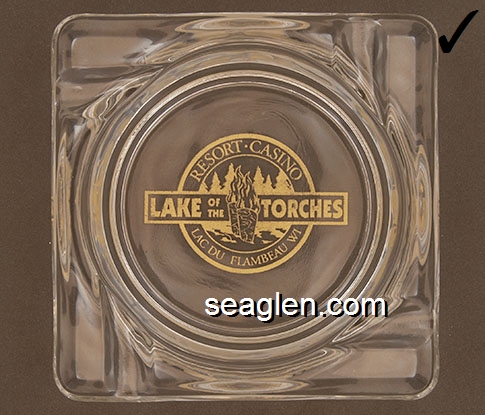 LKT-A1 Lake of the Torches Lac Du Flambeau, WI 4 1/4" Clear Glass Ashtray Gold imprint: Resort - Casino, Lake of the Torches, Lac Du Flambeau WI |