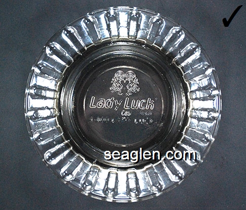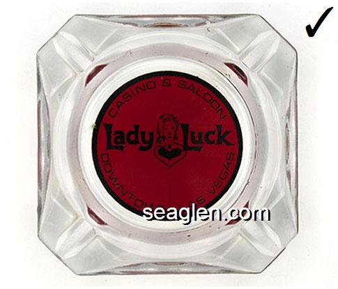 LLC-A1 Lady Luck Casino Las Vegas, NV 3 1/2" Clear Glass Ashtray Black on red imprint: Casino & Saloon, Lady Luck, Downtown Las Vegas (Like LLC-02, except clear glass) |