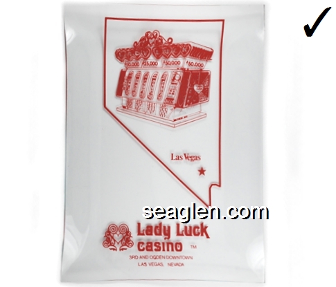 LLC-C1 Lady Luck Casino Las Vegas, NV 7 x 9" Clear Glass Ashtray Red imprint: Lady Luck Casino, 3rd and Ogden Downtown, Las Vegas, Nevada |