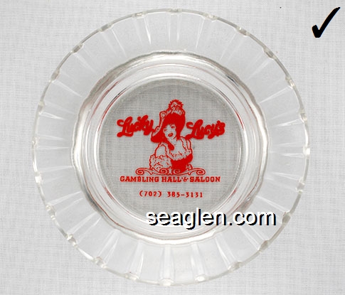 LLG-01 Lucky Lucy's Gambling Hall & Saloon Las Vegas, NV 4 1/2" Clear Glass Ashtray Red imprint: Lucky Lucy's Gambling Hall & Saloon, (702) 385-3131 |
