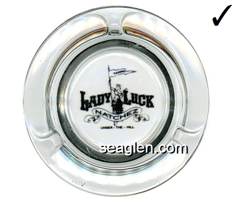 LLN-A1 Lady Luck Natchez Natchez, MS 4 1/2" Clear Glass Ashtray Black imprint: Casino, Lady Luck, Natchez, Under - The - Hill (USA moulded under side) |