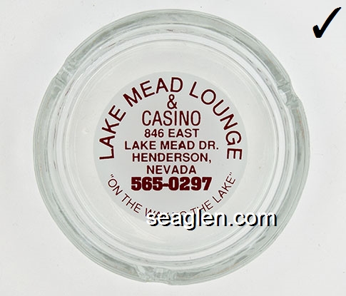 LML-A2 Lake Mead Lounge & Casino Henderson, NV 3 11/16" Clear Glass Ashtray Red on white imprint: Lake Mead Lounge & Casino, 846 East Lake Mead Dr., Henderson, Nevada 565-0297, ''On the Way to the Lake'' |