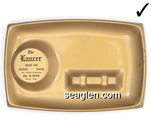 LNC-B1 Lancer Reno, NV 6 x 4" Gold Metal Ashtray Black imprint: The Lancer, Superb Food, Cocktails - Dancing, Mt. Rose Highway, FA 9-3555, Reno, Nev. |