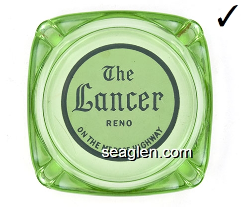 LNC-D1 Lancer Reno, NV 3 1/4" Green Glass Ashtray Black on white imprint: The Lancer Reno, On the Mt. Rose Highway |