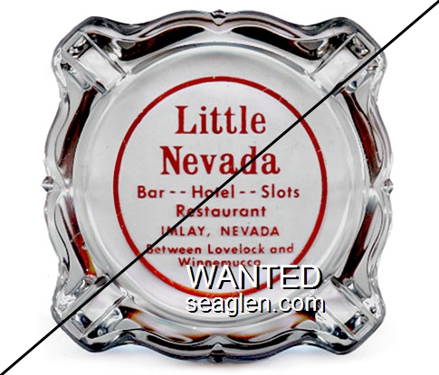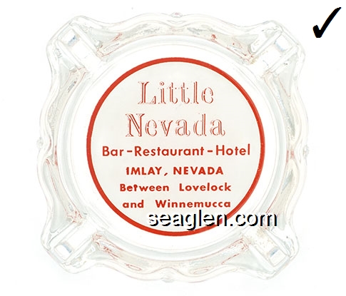 LNV-B1 Little Nevada Imlay, NV 3 1/2" Clear Glass Ashtray Red on white imprint: Little Nevada, Bar - Restaurant - Hotel, Imlay, Nevada, Between Lovelock and Winnemucca |