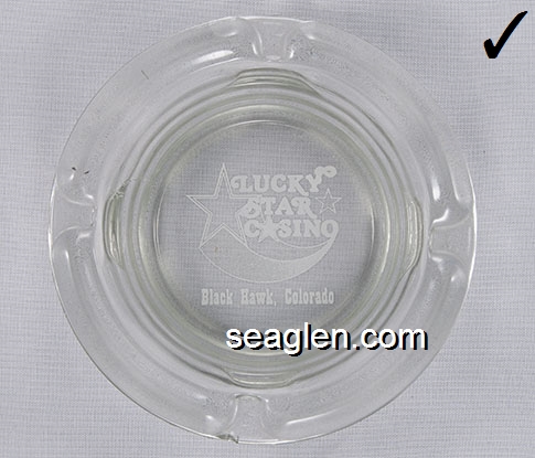 LSC-01 Lucky Star Casino Black Hawk, CO 4 1/2" Clear Glass Ashtray White imprint: Lucky Star Casino, Black Hawk, Colorado |