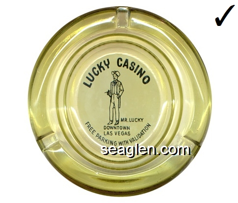 LUK-04 Lucky Casino Las Vegas, NV 3 1/2" Amber Glass Ashtray Black on white imprint: Lucky Casino, Mr. Lucky, Downtown Las Vegas, Free Parking with Validation |