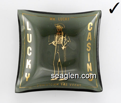 LUK-02 Lucky Casino Las Vegas, NV 2 3/16" Smoke Glass Ashtray Gold imprint: Mr. Lucky, Downtown, Las Vegas |