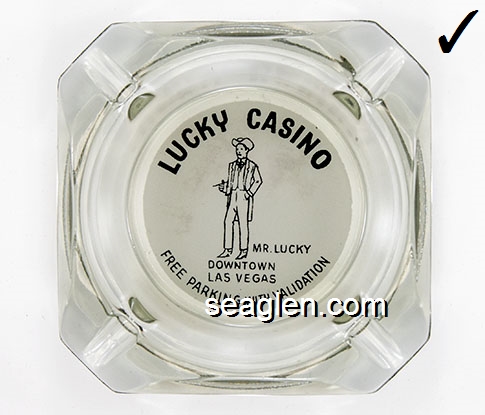 LUK-A2 Lucky Casino Las Vegas, NV 3 1/2" Smoke Glass Ashtray Black on white imprint: Lucky Casino, Mr. Lucky, Downtown Las Vegas, Free Parking with Validation (Like LUK-04, except smoke glass) |
