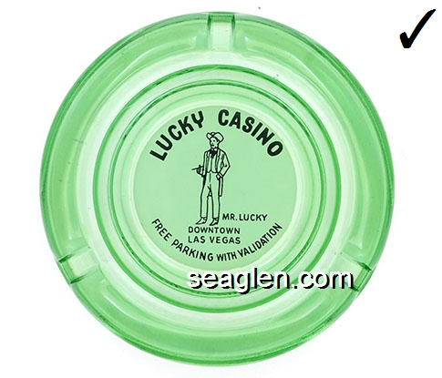 LUK-B1 Lucky Casino Las Vegas, NV 4 1/4" Green Glass Ashtray Black on white imprint: Lucky Casino, Mr. Lucky, Downtown Las Vegas, Free Parking with Validation (Like LUK-01, except green glass) |