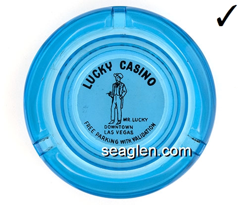 LUK-A3 Lucky Casino Las Vegas, NV 3 1/2" Blue Glass Ashtray Black on white imprint: Lucky Casino, Mr. Lucky, Downtown Las Vegas, Free Parking with Validation (Like LUK-04, except blue glass) |