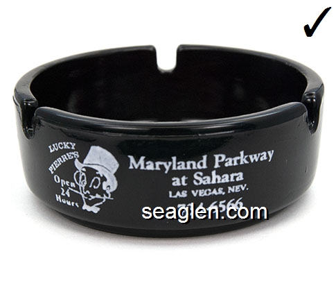 LUP-02 Lucky Pierre's Las Vegas, NV 3 1/2" Amethyst Glass Ashtray White imprint: Lucky Pierre's, Open 24 Hours, Maryland Parkway at Sahara, Las ... Beer & Wine, Film 24 Hr. Service, Cigars - Candy, Cigarettes |