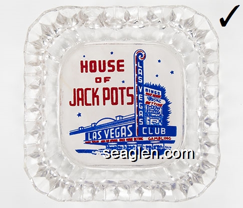 LVC-D1 Las Vegas Club Las Vegas, NV 4 1/2" Clear Glass Ashtray Red and blue on white imprint: House of Jackpots, Las Vegas Club |