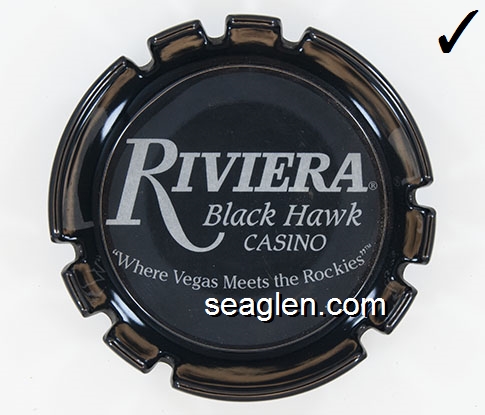 RBH-D1 Riviera, Black Hawk Black Hawk, CO 4 1/8" Black Plastic Ashtray White imprint: Riviera Black Hawk Casino, ''Where Vegas Meets the Rockies'' |