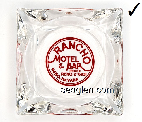 RBR-A1 Rancho Bar Reno, NV 3 1/2" Clear Glass Ashtray Red imprint: Rancho Motel & Bar, Phone Reno 2-6931, Reno, Nevada |