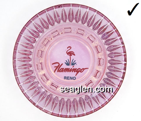 REH-D2 Reno Hilton Reno, NV 4 7/8" Pink Glass Ashtray Pink and green imprint: Flamingo Reno |