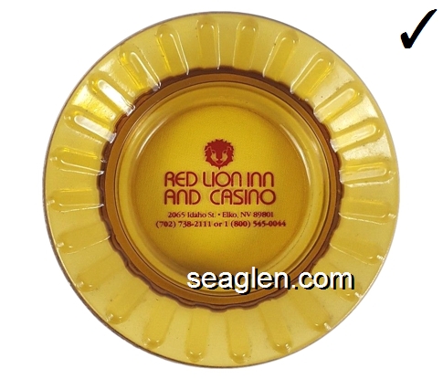 REL-01 Red Lion Inn & Casino Elko, NV 4 1/2" Amber Glass Ashtray Red imprint: Red Lion Inn & Casino, 2065 Idaho St. - Elko, NV 89801, (702) 738-2111 or 1(800) 545-0044 |