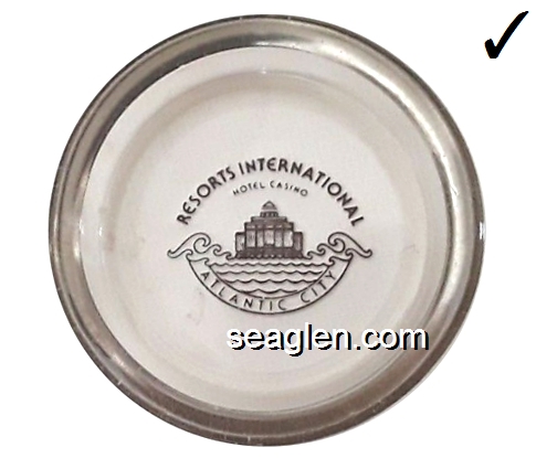 RIV-E7 Riviera Hotel Las Vegas, NV 3 9/16" Clear Glass Ashtray Red and white imprint: Las Vegas Riviera Las Vegas, Delmonico, Cafe Noir, Lighthouse (Like RIV-10, except smooth bottom) |