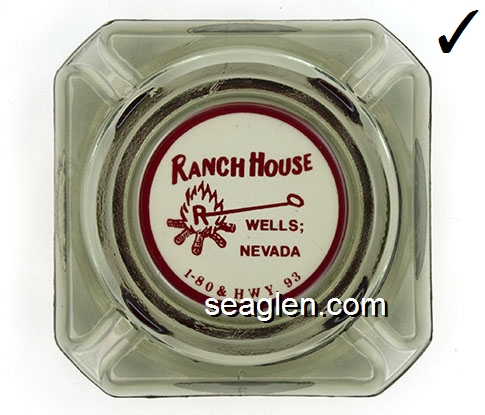 RHC-A1 Ranch House Casino Wells, NV 3 1/2" Smoke Glass Ashtray Red on white imprint: Ranch House, Wells, Nevada, Highway U.S. 40 |