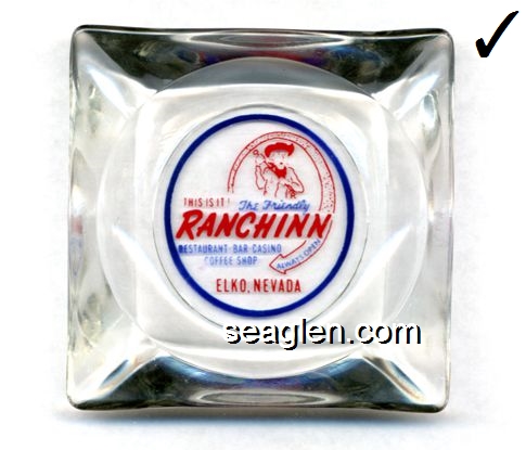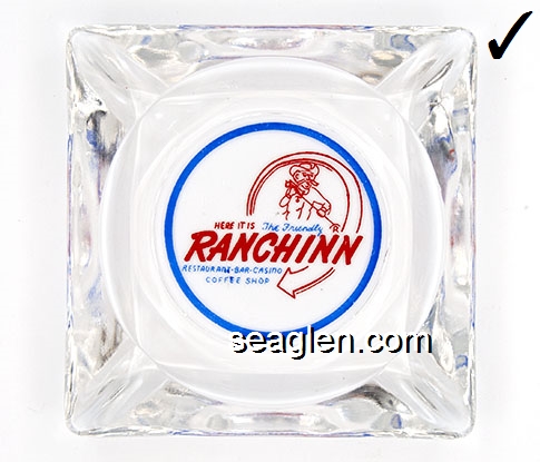 RIN-C1 RanchInn Elko, NV 3 5/8" Clear Glass Ashtray Red and blue imprint: Here It Is, The Friendly Ranchinn Restaurant - Bar - Casino, Coffee Shop |