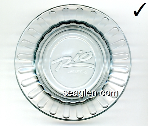 RIV-E6 Riviera Hotel Las Vegas, NV 3 1/2" Clear Glass Ashtray Red and white imprint: Las Vegas Riviera Las Vegas, Delmonico, Cafe Noir, Lighthouse (Like RIV-10, except with 13 rings) |